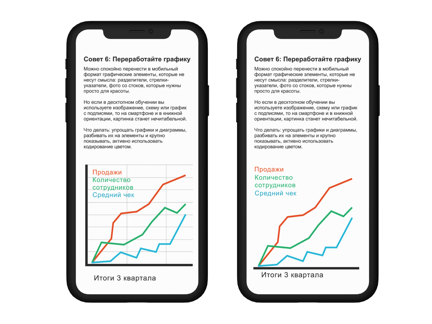 Но если в десктопном обучении вы используете изображение, схему или график с подписями, то на смартфоне и в книжной ориентации, картинка станет нечитабельной.