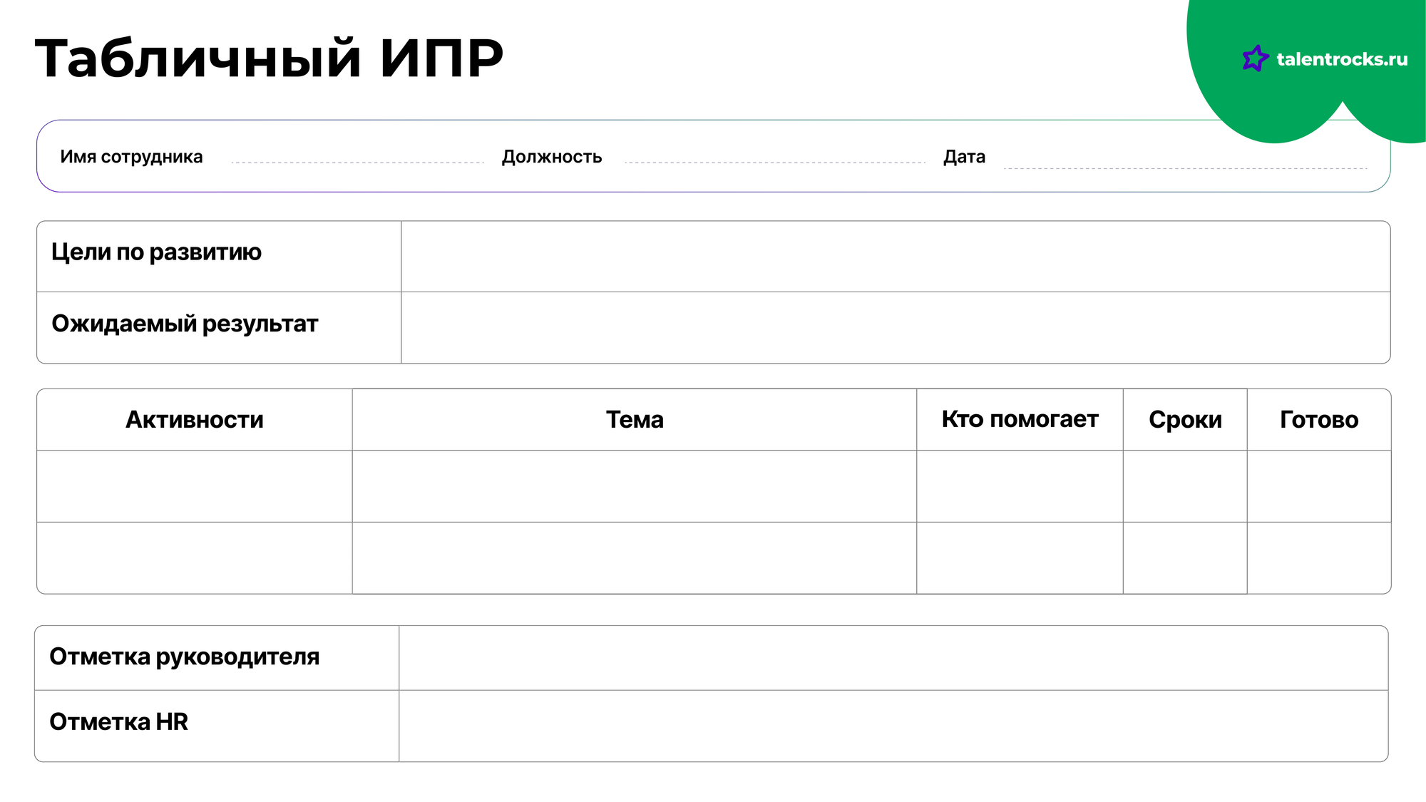 ИПР — это документ, который описывает профессиональные и карьерные цели конкретного сотрудника. План сотрудника можно считать частью карьерного трека. Но если траектория развития описывает путь сотрудника в компании, то ИПР показывает, что для этого нужно сделать.
