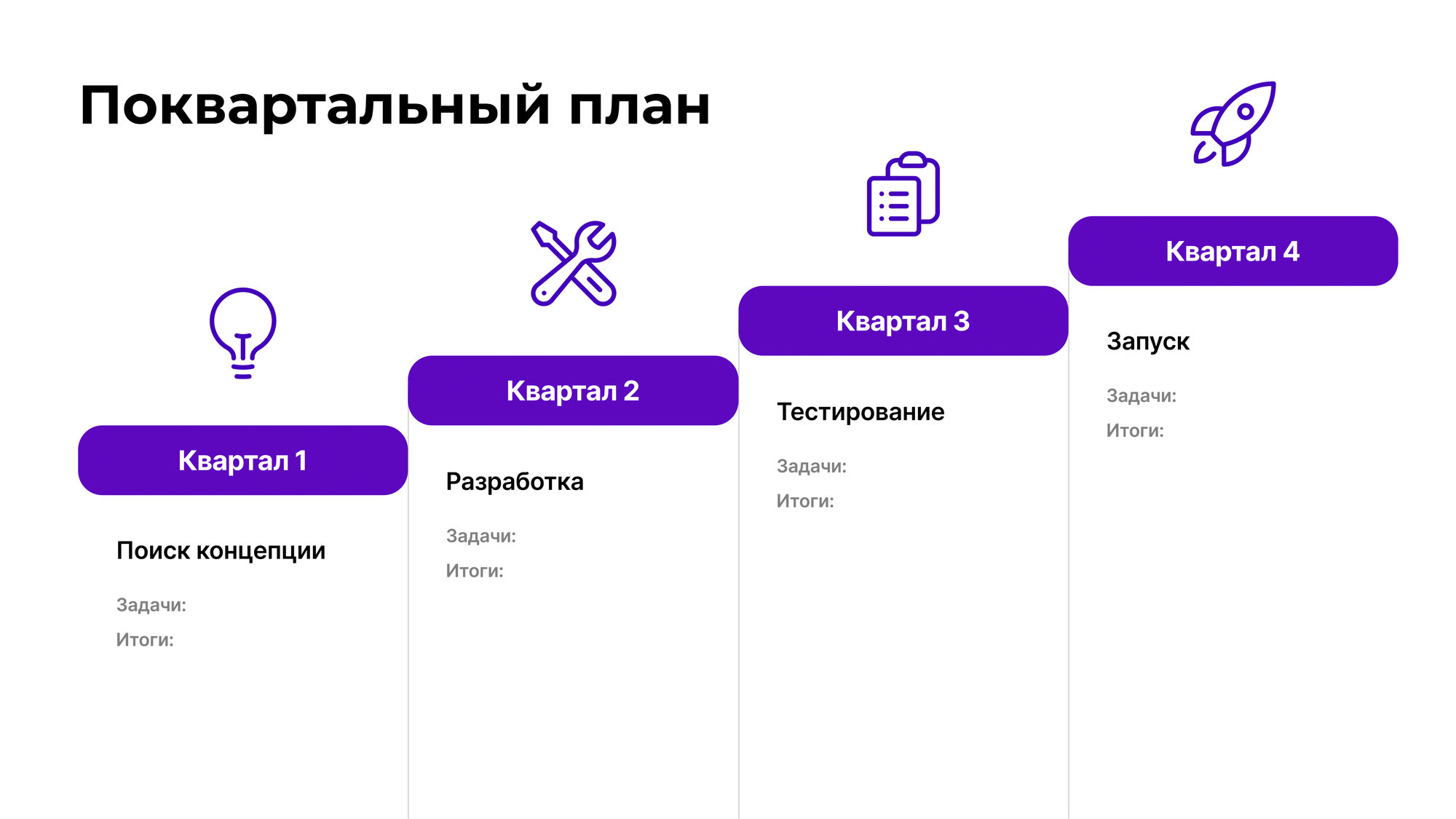 Шаблон, который можно использовать самостоятельно или в составе большого ИПР. Лучше всего он подходит, когда итоговым результатом должен стать какой-то продукт или запущенный проект. Название «поквартальный» скорее условно, а между блоками можно вставить промежуточные этапы, например для подведения результатов.
