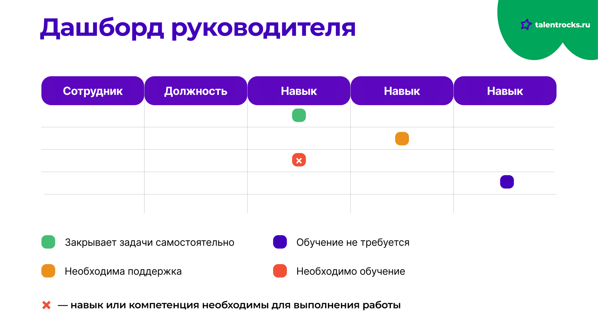 С помощью этого шаблона менеджер может отслеживать состояние навыков подчиненных и решать, кого нужно отправить на дополнительное обучение, а кому ИПР.