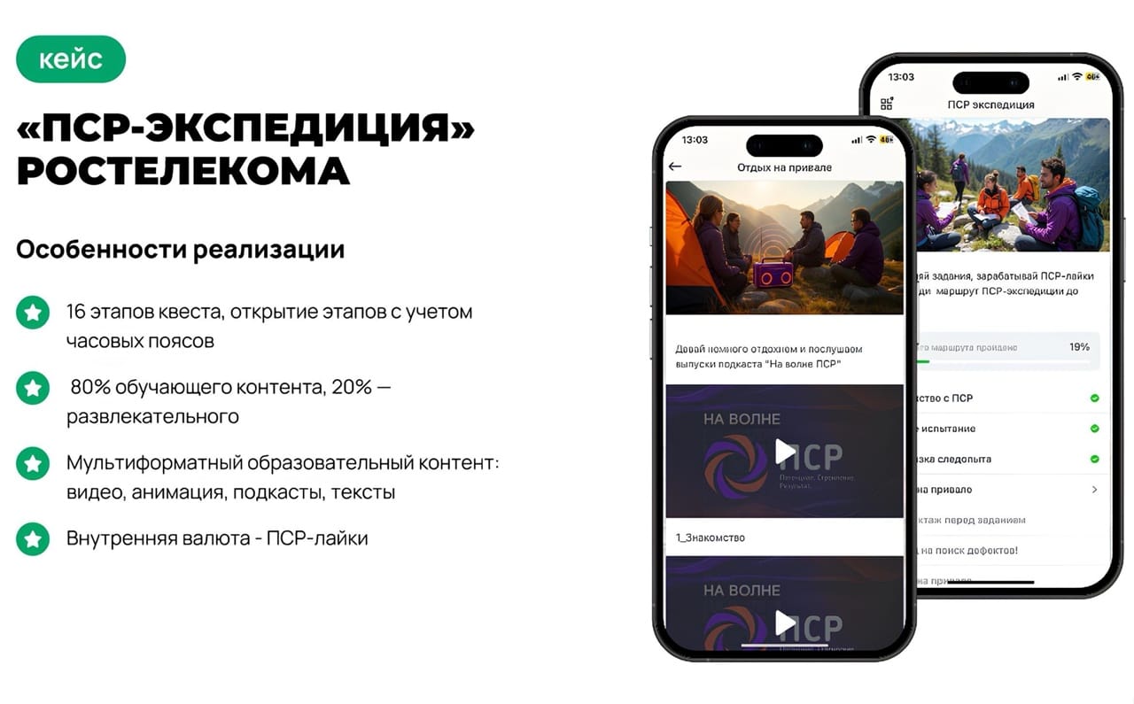 Так, в Ростелеком запустили ПСР-экспедицию, — онлайн-программу по принципам производственной системы компании. В течение пяти дней участники проходили интерактивные этапы: видео, подкасты, задания и рейтинги. За активность начислялась внутренняя валюта.