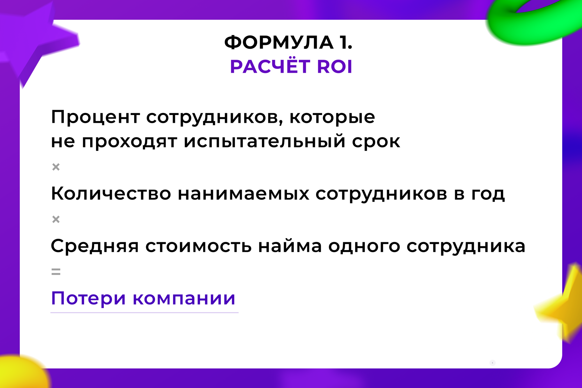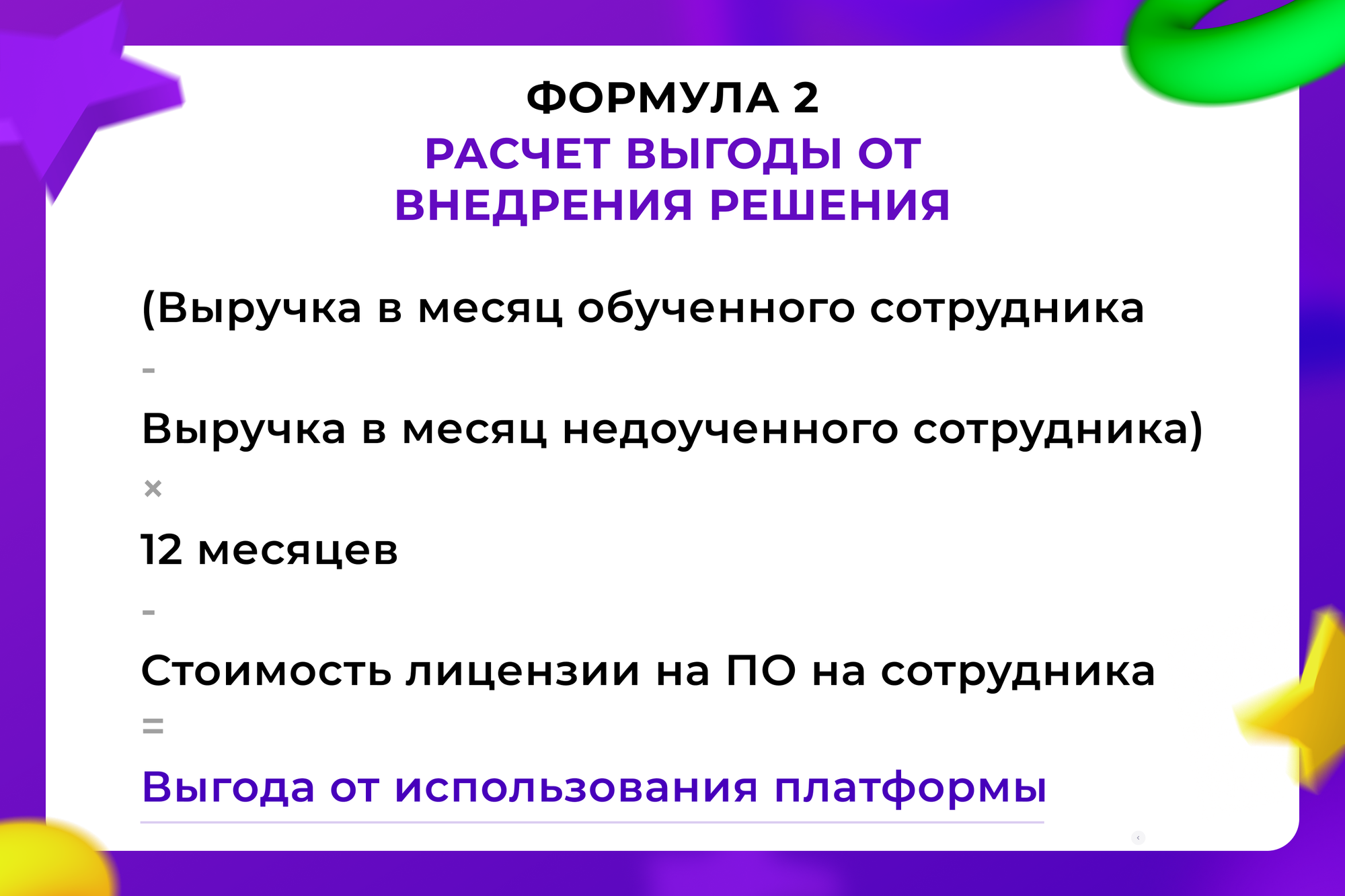 Расчёт ROI помогает оценить экономию от адаптации, а эта формула больше подходит для уже работающих сотрудников, например, когда нужно запустить обучение и платформу для него.