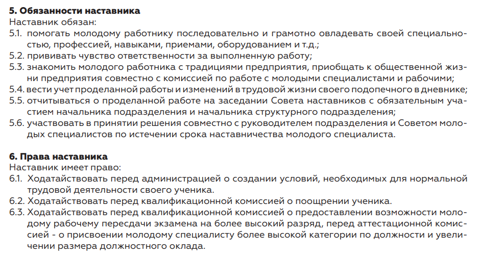 Точно также нужно описать и наставников. Иногда указывают нижнюю планку, название должности или конкретное подразделение. Например: «Наставником может стать сотрудник отдела снабжения с опытом работы не менее трёх лет на момент подписания документа, в должности не ниже старшего специалиста».