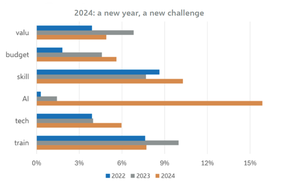 Стоит обратить внимание, что слово «технологии» почти не меняло позиции почти 2 года, но выстрелило в 2024. И это связано не только с ИИ, но и возможностями, которые он может предложить L&D. Также заметно выросла ценность «навыков». А вот значение «бюджет» упало. Видимо тоже, потому что появились общедоступные инструменты ИИ, которые позволили удешевить разработку.