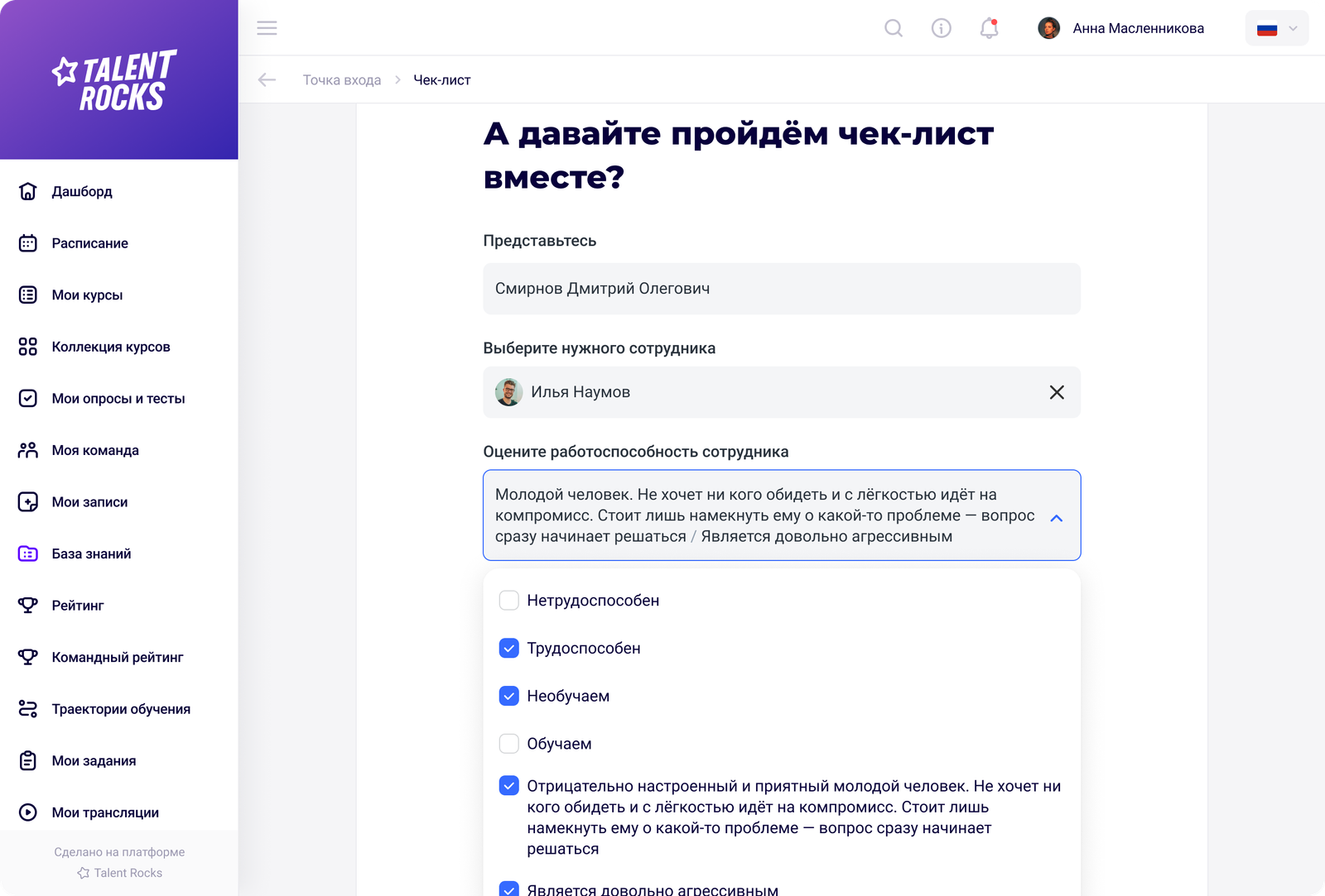 Чек-листы на платформе Talent Rocks